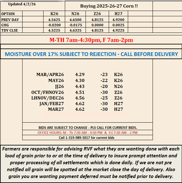 Let us know if you would like to sign up for our daily grain bid text.